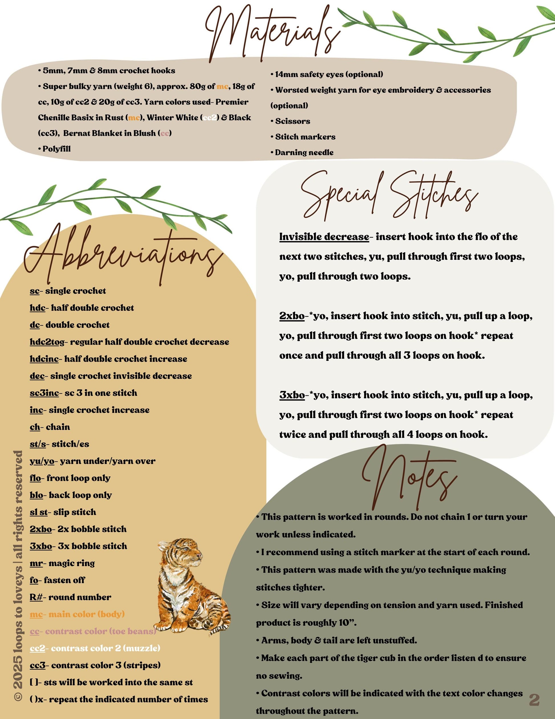 Pattern Details: ✿Skill Level: Intermediate (basic amigurumi knowledge required) ✿Language: English (written in US crochet terms) ✿Includes step-by-step instructions with clear photos (link to eye embroidery tutorial) ✿ Features two cub designs (lion & tiger) ✿ Includes bow and flower crown accessories for a customizable look ✿ Unstuffed snuggler body perfect for babies & toddlers!